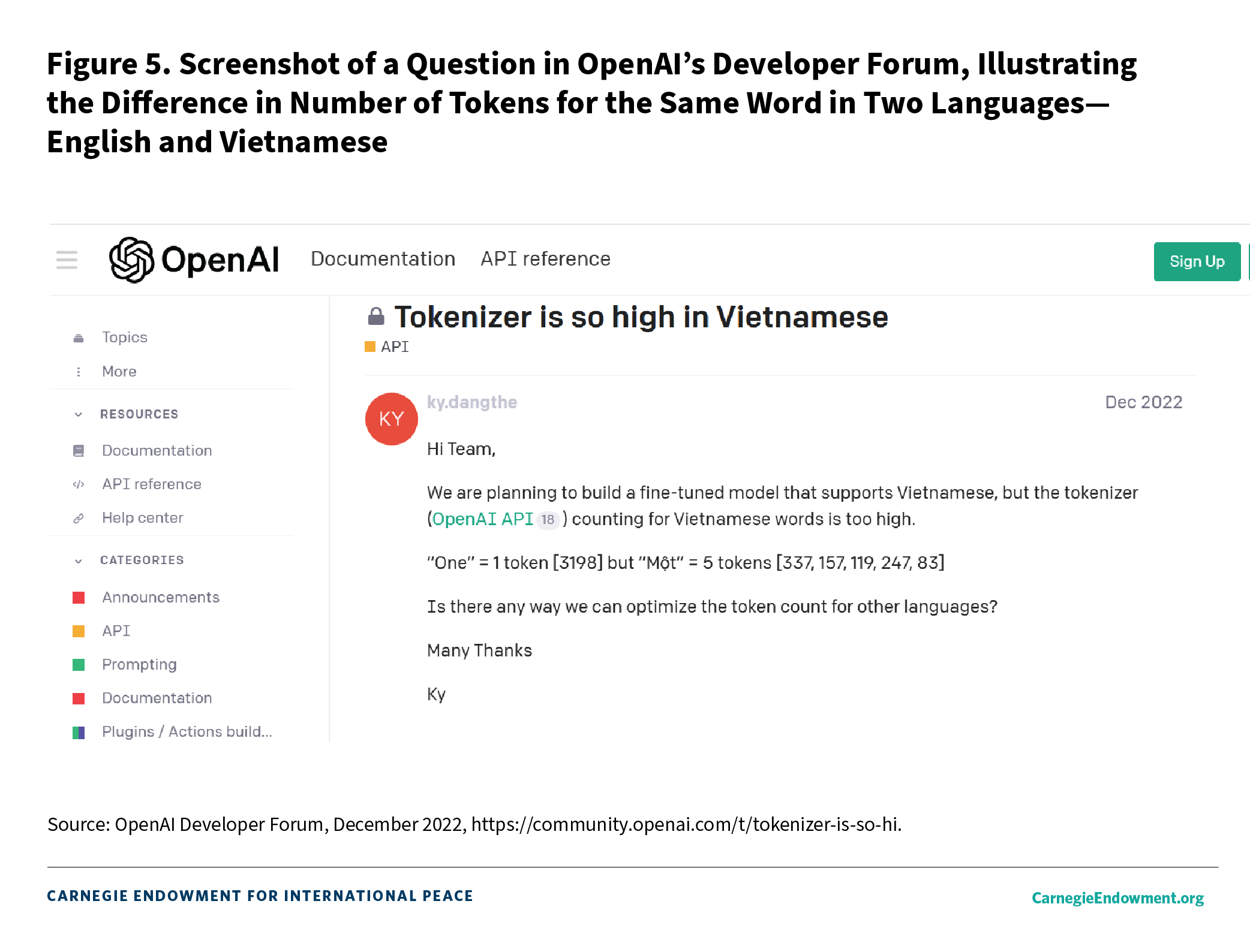 Research shows that tokenizers of popular, advanced models are biased in favor of Latin-scripted languages and over-fragment less represented languages or scripts. More fragments mean more tokens, which in turn raises costs on already expensive tokenizer software for developers in the region (see figure 5). Further, these tokens do not always perform well on less represented languages despite their relatively higher costs.83