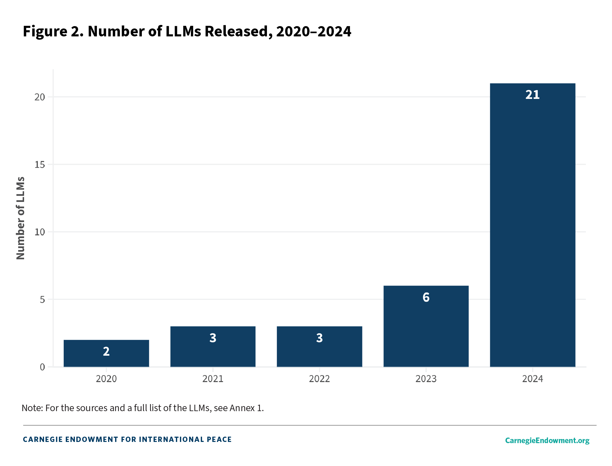 Between 2020 and 2024, researchers released a total of thirty-five LLMs specific to the region (see figure 1), a remarkable number in that timeframe but one that’s not wholly surprising given the enormous commercial and research potential presented by localized LLMs.