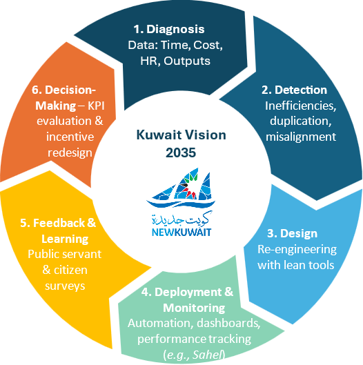 This cycle repeats, ensuring reforms are institutionalized rather than treated as one-off interventions. Each iteration sharpens decision-making, reduces waste, and strengthens public trust. By adopting such a loop, Kuwait can shift from reactive reform to proactive governance—minimizing institutional waste at its root and ensuring that digitization is accompanied by genuine process improvement.