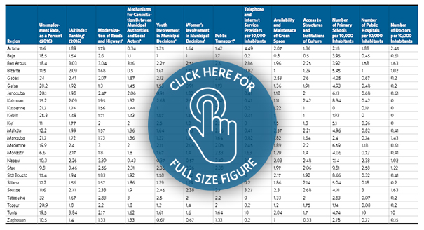 Actuellement, la Tunisie souffre d’énormes disparités régionales sur pratiquement tous les indicateurs (voir tableau 1). En 2013, 18 municipalités (y compris Tunis et ses banlieues de La Marsa, La Goulette, Sidi Bou Said, et Carthage) détenaient 51% du budget municipal de l’Etat, alors que 246 autres détenaient les 49% restants.9 Une étude réalisée par l’Organisation Internationale du Travail en juin 2017 a révélé d’énormes inégalités dans de nombreuses régions quand on compare les taux de pauvreté, le pouvoir d’achat et la qualité et proximité des services publics.10 Dans le dernier budget du régime Ben Ali avant sa chute, 82% des fonds publics étaient consacrés aux zones côtières, contre seulement 18% pour l’intérieur du pays.