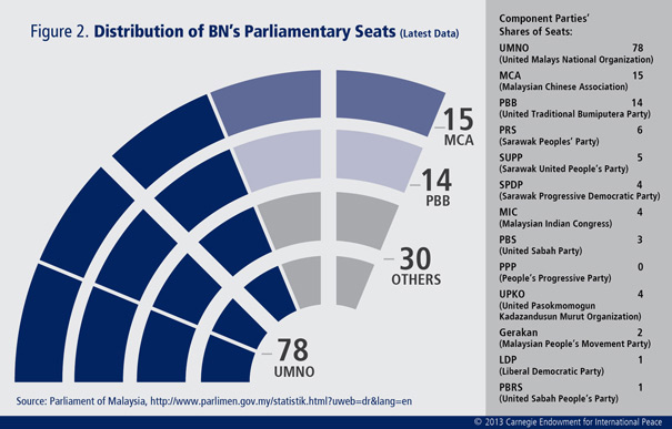 BN consists of thirteen parties. The largest of them, the United Malays National Organization (UMNO), has traditionally led the coalition and occupied the most seats in parliament (see figure 2).