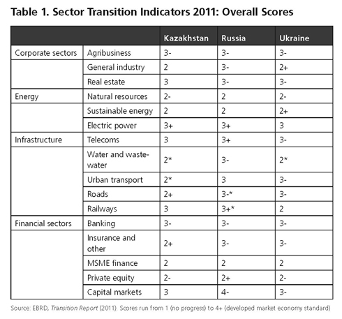 Table 1 compares Ukraine on these indicators with Kazakhstan and Russia, the other two large, partly resource-based, partly industrial countries in the post-Soviet space. Though the scoring looks simple, it is in fact quite complex. For instance, the agribusiness score is a composite of seven criteria, with a total of 30 indicators. A similarly low score may thus tell of very different problems in each country. Altogether there are several hundred sector/country ratings behind the overall EBRD picture of 29 countries.15 A star denotes those indicators that have improved since 2010, all by just one grade.