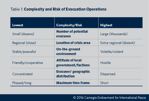 Whether led by diplomatic or military authorities, expatriate evacuation operations are typically divided into four stages: the assessment, planning, operational, and post-evacuation phases. During the pre-evacuation emergency assessment—essential to developing an efficient response—on-the-ground information is collected. What is the source of the emergency situation, and what specific threats does it pose to the migrants? How many migrants are in the country or region, what are their socioeconomic or political profiles and degree of exposure to the crisis, and what actions have they taken or are expected to take?