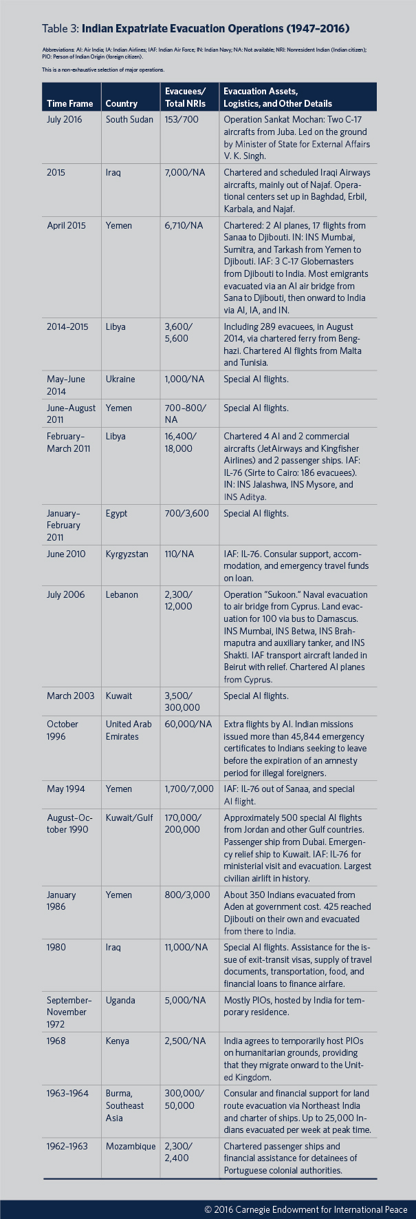 However, beyond the increase in governmental interest in recent years, India has vast experience in conducting expatriate evacuation operations. While there is much research on the doctrines, emergency plans, and standard operating procedures of other countries, little is known about the Indian tradition, leading many analysts to conclude that India is either inexperienced or incapable of safely bringing its diaspora home in times of crisis. In reality, however, over the last few decades, India has conducted more than thirty complex operations to rescue its distressed citizens abroad.41 Table 3 includes a few examples and offers some details on the logistics involved.