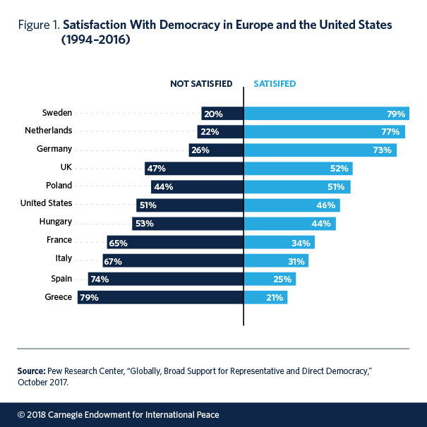 In Europe, confidence in political institutions dropped sharply after the onset of the euro crisis. According to Eurobarometer, trust in national parliaments across the European Union fell from 38 percent in 2004 to 28 percent in 2016, while trust in national governments declined from 34 percent to 27 percent.9 However, these averages conceal significant variation between and within countries: the decline in trust was much starker among poorer Europeans and residents of Southern Europe.10 A 2017 Pew Global Attitudes Survey showed alarmingly low levels of satisfaction with the functioning of democracy in France, Greece, Italy, and Spain (see figure 1). It also revealed a large gap in satisfaction with democracy between those Europeans who think the economy is doing well and those who do not—a difference of more than 40 percentage points in France, Hungary, Italy, the Netherlands, Poland, and Sweden.11