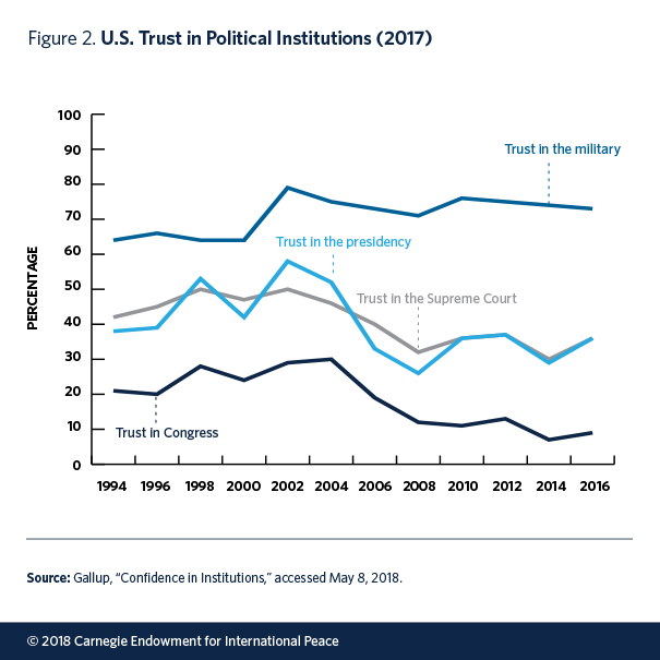 The past few years have indeed been characterized by low levels of trust in political institutions and leaders on both sides of the Atlantic. In the United States, the percentage of Americans who expressed a “great deal” or a “fair amount of trust” in political leaders declined from 63 percent in 2004 to 42 percent in 2016, a new low in more than four decades.6 In 2017, only 12 percent of Americans expressed a “great deal” or “quite a lot” of trust in Congress, down from an already relatively low 30 percent in 2004.7 An index measuring “system support”—the degree to which Americans view their political system as fundamentally legitimate—shows a decline by 18 points between 2006 and 2014.8