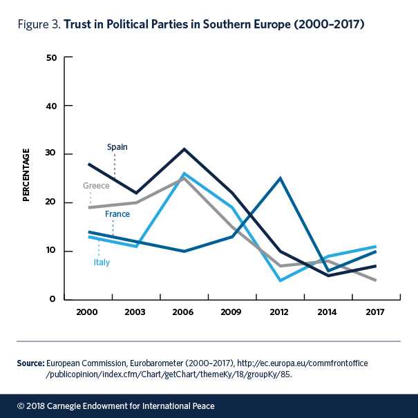 Indeed, some crucial challenges are clearly shared now. In Europe as well as in the United States, popular trust in political institutions has declined in recent years. Many voters are disenchanted with mainstream political parties, which they see as ineffective and out of touch. This groundswell of antiestablishment sentiment has benefited outsider movements and candidates. U.S. and European democracies are also grappling with a more fragmented public information space and foreign efforts to sow disinformation and mistrust—as well as threats to civil liberties emanating from expanding executives and illiberal government action. These trends, while not entirely new, have been brought to a head by economic crisis, hardening contestation over migration and diversity, and changing geopolitical currents.