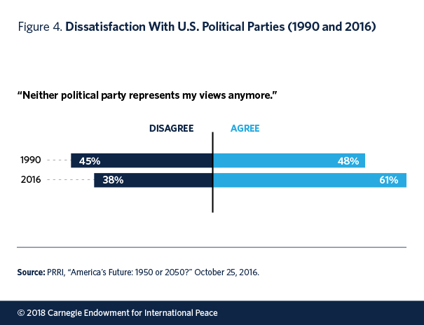 In the United States, the majoritarian electoral system creates a fundamentally different party landscape, with limited opportunities for new party formation. Yet voter identification and satisfaction with political parties has also declined. Ahead of the 2016 election, six in ten Americans said that neither major party represented their views—a thirteen percent increase since 1990 (see figure 5).31 A July 2017 Gallup poll showed 45 percent of Americans identifying as independent, indicating a dislike for both parties.32 At the same time, most Americans now live in uncompetitive congressional districts, meaning that they have little meaningful choice to begin with.33