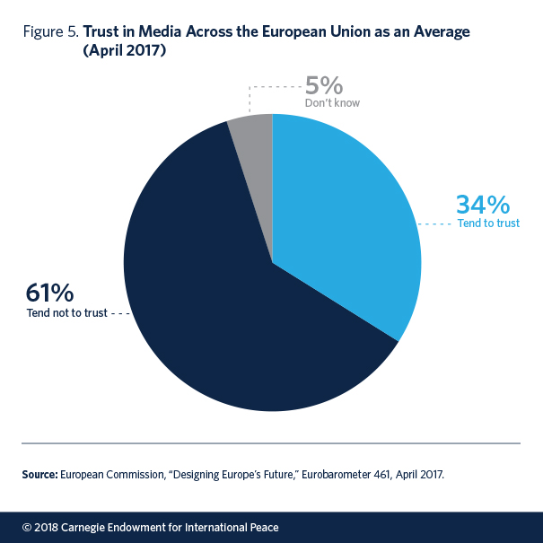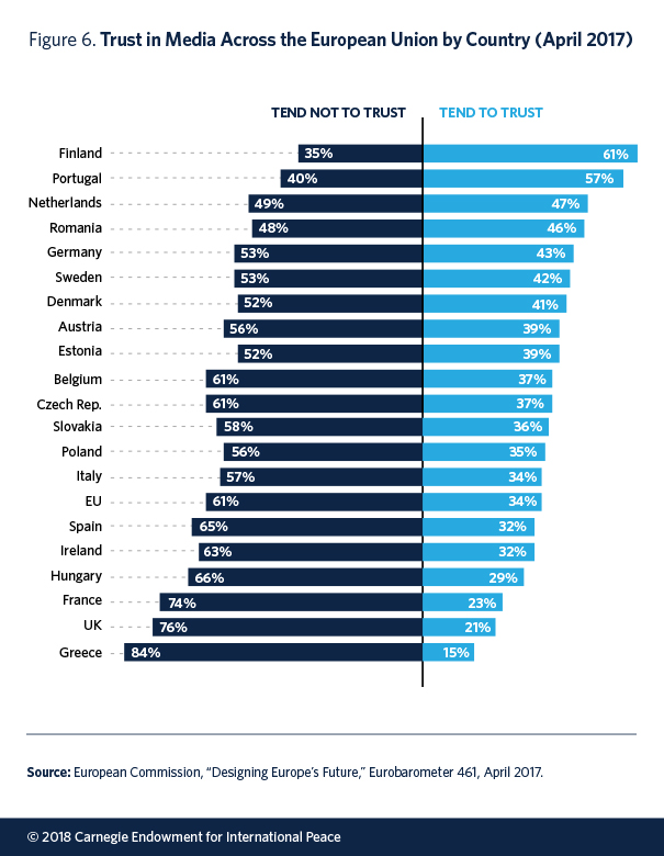 Several trends are worth highlighting. First, many Western democracies are characterized by relatively low levels of trust in traditional media outlets. A 2017 Eurobarometer survey found that only 34 percent of respondents across Europe claimed to trust the media (see figure 6), with particularly low levels of trust in France, the UK, and Greece (see figure 7). Those who placed themselves in the lower-middle or working class and were worse off economically were particularly likely to express distrust.40 Throughout Europe, news consumers tend to have greater trust in radio and TV than in social networks and the written press.41