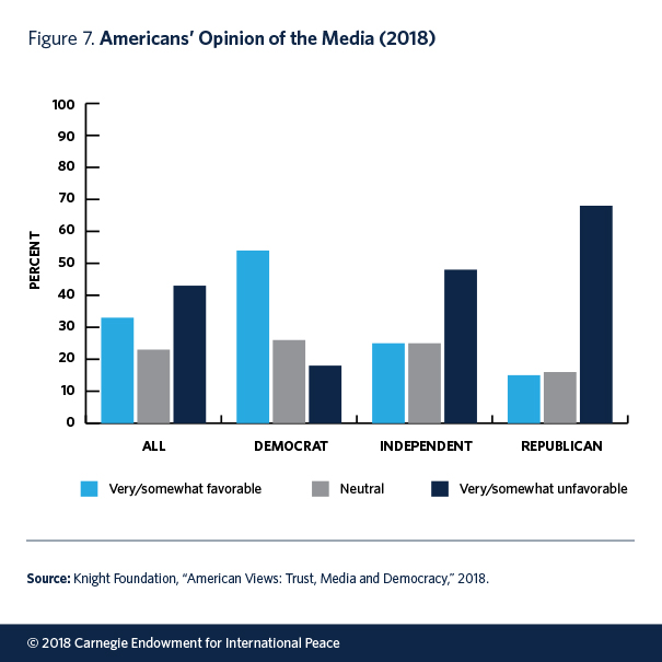 In the United States, trust in the mass media has decreased from 53 percent in 1997 to 32 percent in 2016, according to polling data.42 Distrust in the media appears to be fueled by—or at least correlated with—heightened partisanship. A new study by Gallup and the Knight Foundation, for example, found that Republicans are considerably more likely to have unfavorable views of mainstream news organizations (see figure 8), a trend mirrored in Trump’s repeated attacks on prominent news outlets. And while 60 percent of Republicans view Fox News as an objective media outlet, only 3 percent of Democrats agree.43 Comparative analyses show that the American media environment is indeed much more ideologically polarized than that of other Western democracies—perhaps partly due to the absence of a centrist public broadcasting organization that captures both left- and right-wing voters.44