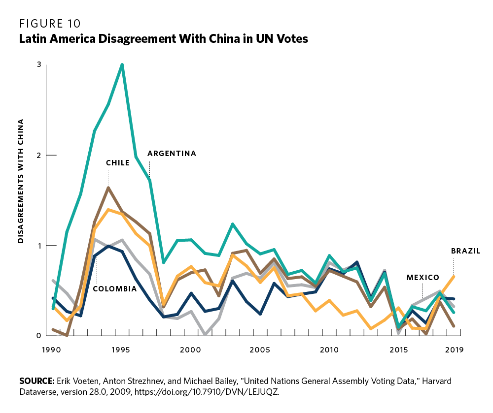 Overall, it is undeniable—and largely inevitable—that China’s influence in Latin America will grow. In the past four years, the Dominican Republic, El Salvador, and Panama have formally recognized China. This shift has increased the number of votes that China can obtain for its appointees to international organizations (see figure 10). Beijing has developed strategic partnerships with 10 countries; it has free trade agreements with Chile, Costa Rica, Peru; and it is negotiating another with Panama. It is now a central partner for infrastructure development. Already, nineteen governments across Latin America and the Caribbean have joined Xi Jinping’s signature Belt and Road Initiative, a $1 trillion trade and infrastructure network. China also seeks to introduce technological standards in regional infrastructure (such as dams, railways, ports, and mobile infrastructure) and thus secure long-term customers.