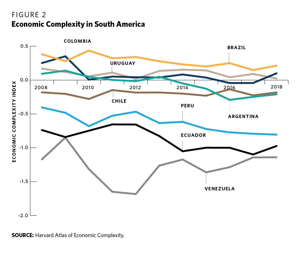 Finally, the region’s challenging economic context must be considered. Numerous Latin American countries have stopped growing or did so at lower rates than in the early 2000s (see figure 1). When growth did take place, it happened at lower rates than other developing regions. Intraregional trade, for example, grew slower for most countries than extraregional trade.36 For most Latin American countries, trade with China and the United States is now far more important than trade with neighboring countries. Reflecting the growth of the commodities markets, particularly in China, Latin America’s economic complexity has been reduced (see figure 2). This re-primarization of its trade does not favor more regional integration, as it is the faltering manufacturing sector that drives regional exchange.