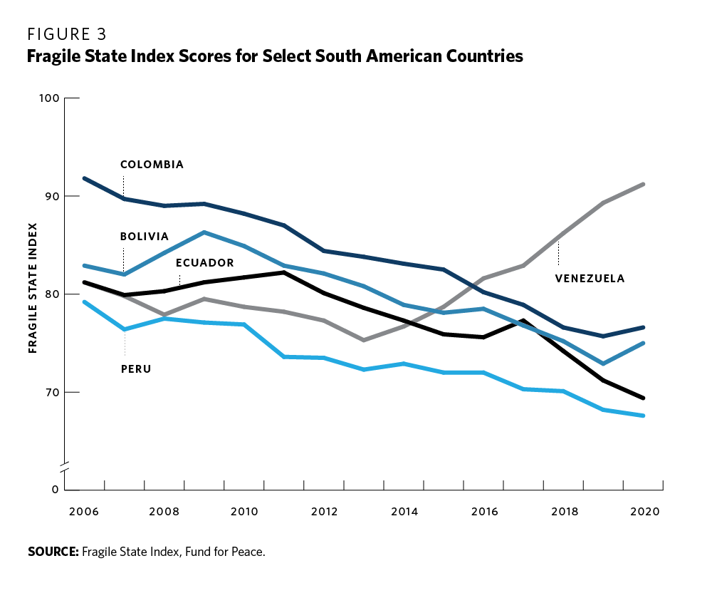 Another regional trend, present in both Ecuador and Peru as well as in other countries, has been the acute fragmentation of political parties, which has made governance exceedingly difficult.12 Colombia is in the midst of a serious crisis with widespread protests and a resurgence of politically driven violence, with one social leader killed every forty-one hours.13 Argentina’s economy has hit rock bottom as its government aims to reach a deal with the International Monetary Fund while tackling high inflation rates. Following former U.S. president Donald Trump’s playbook, Brazil’s right-wing Bolsonaro continuously glorifies dictatorship and tests the resilience of Brazil’s democratic institutions. In May 2020, for instance, Bolsonaro, while facing allegations that he tried to meddle with law enforcement for personal reasons, had to be convinced by generals to not ask soldiers to close the Supreme Court.14 Chile, once regarded as one of the region’s few bright spots due to its economic growth and political stability, also has witnessed massive demonstrations and violent riots against the establishment. It now has the daunting task of attempting to design a new constitution even as it struggles to respond to the pandemic and undertake a rapid vaccination program to protect its citizens.