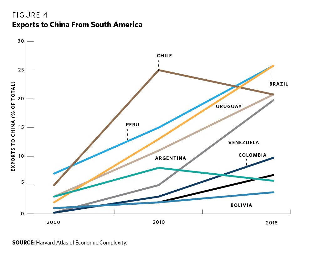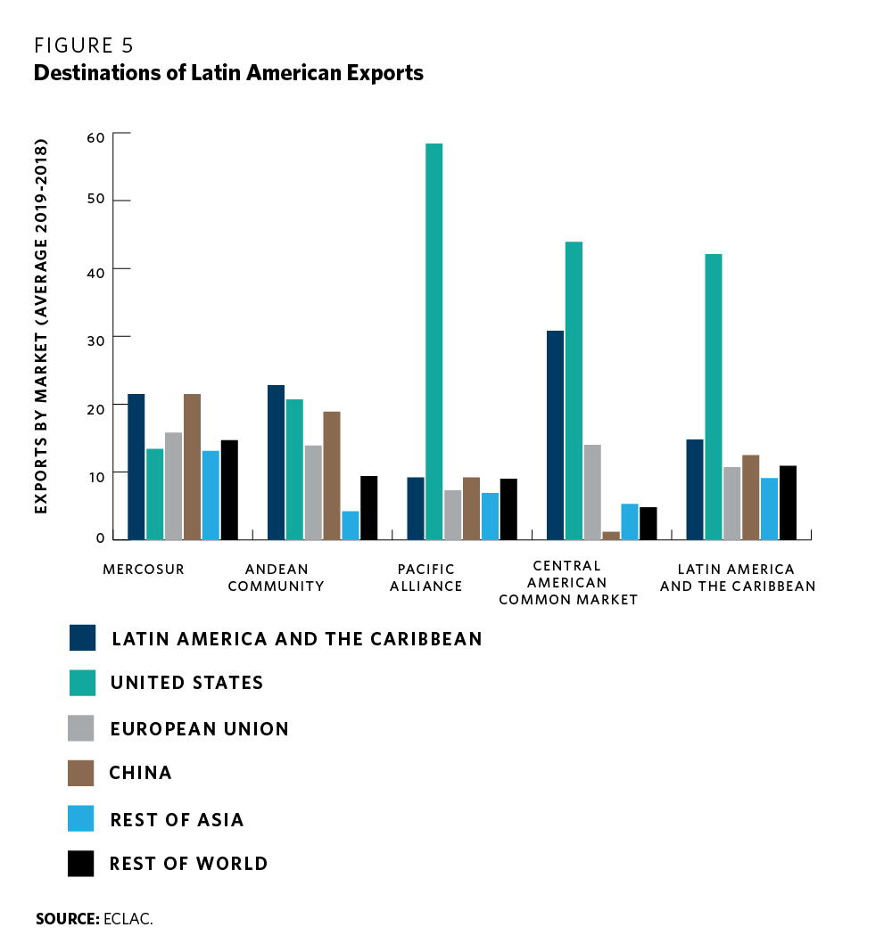 The region’s rugged geography makes commercial integration difficult. Distances are vast, communication channels (navigable rivers, railroads, or binational routes) are scarce or nonexistent, and natural barriers such as the Andes Mountains or the Amazon Rainforest make any attempt at communication costly. Beyond geography, Latin American economies are not complementary and exhibit similar export patterns (based on livestock, crops, and mineral resources) and lack of diversification. China’s transformation into a major consumption market for Latin American products has made this trend more apparent as countries have begun to compete to place their exports there. China is now the main export destination for Brazil, Chile, Peru, Venezuela, and Uruguay, and is the second destination for Argentina and Colombia (see figure 4).