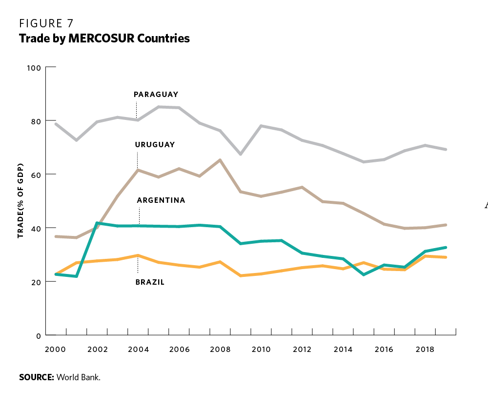 The Pacific Alliance, comprising Chile, Colombia, Mexico, and Peru, has signaled its aim to further integration, yet its internal trade ties are currently limited. As for Mercosur, the bloc needs to be reimagined (see figure 7). Dante Sica and Andrés Malamud condemn it as “a zombie [that] favors the stability of the presidents and symbolically pleases the peoples. But it does not create its own markets, it does not gain foreign markets, it does not provide prestige and it does not favor structural reforms. It must be transformed or it will sink into irrelevance.”67 Brazil and Uruguay are pushing to modify Mercosur’s rules. They would like, if necessary, to be able to sign agreements with third countries independently. “We need to find those flexibilities,” said Ernesto Araujo, Brazil’s former foreign minister, in February 2021.68 They also would like to see a gradual reduction of the bloc’s Common External Tariff, an issue that has been long debated within the bloc. True, the common tariff, the cornerstone of a custom union, still is high, contains many exceptions, and undermines the competitiveness of the bloc. Yet trade politics is also domestic politics, and therefore contains much more than an economic rationale. Argentina and Brazil have so far been reluctant to alter entrenched trade-offs between protection, employment, and political support.