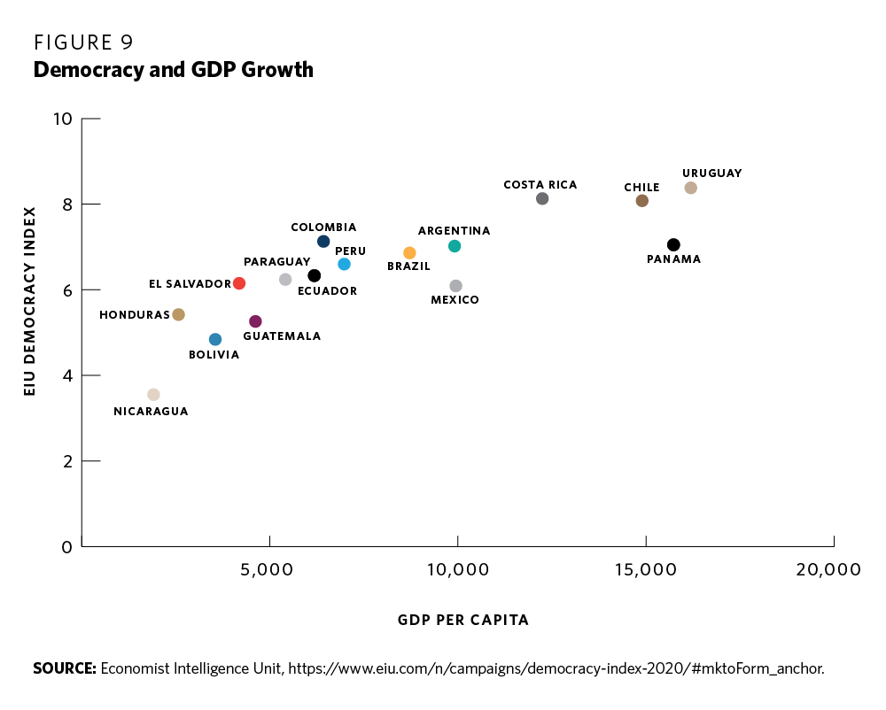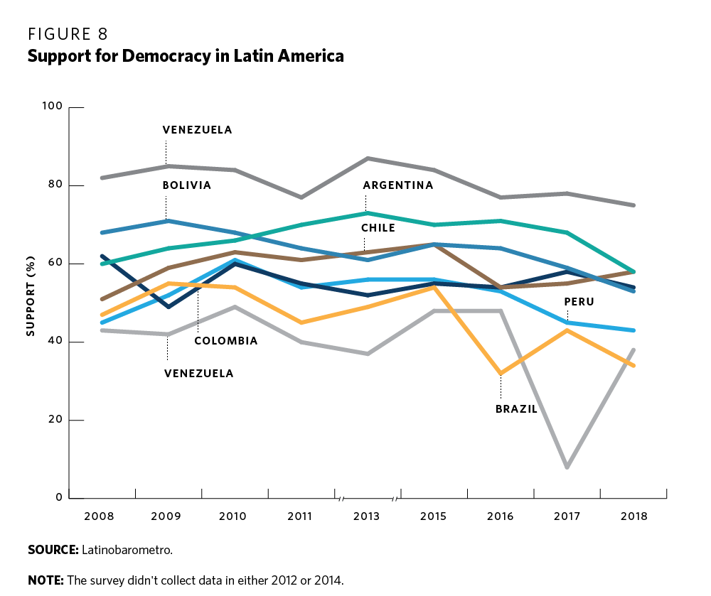 Risks and opportunities ahead. The V-Dem Institute’s annual assessment on the state of democracy warns about a worrisome trend toward democratic backsliding around the world.71 Similarly, the Economist Intelligence Unit report on the state of democracy worldwide shows that the average global democracy score in 2020 is the worst it has been since 2006.72 Latin America has not been immune to these trends (see figure 8). A sentiment of dissatisfaction with democracy has continued to grow. Since the end of the commodity boom in 2014, Latin America’s economy has grown at an annual average of merely 0.8 percent.73 Citizens are thus seeing their demands for more education, jobs, healthcare, and quality public transport frustrated while a small part of the population sees their fortunes grow. The pandemic has only increased this frustration. Furthermore, citizens observe their governments’ often fruitless struggles to reduce corruption levels. In Peru, the past six presidents have been imprisoned or prosecuted (and one committed suicide) due to corruption cases, almost all of which were linked to the Lava Jato investigation.