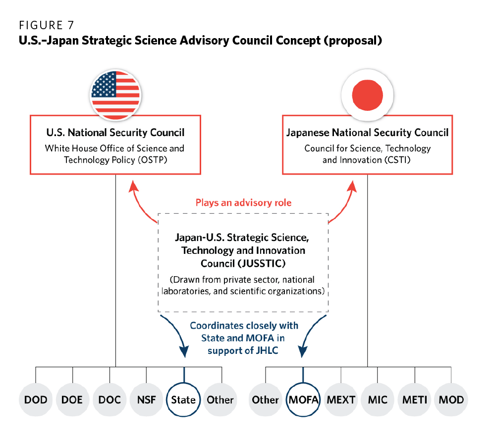 178 This recommendation was first presented in James L. Schoff’s “U.S.-Japan Technology Policy Coordination: Balancing Technonationalism with a Globalized World.” The Japan-U.S. Strategic Science and Technology Innovation Council proposed here stems from an idea explained to the author by Douglas Rake in 2017 for a bilateral nonprofit initiative exploring ways to derive greater benefit from current U.S.-Japan S&T collaboration in support of long-term shared strategic priorities. Rake, Schoff, and several others have collaborated to realize this concept known as the Japan-U.S. Strategic Science, Technology, and Innovation Initiative (JUSSTII).