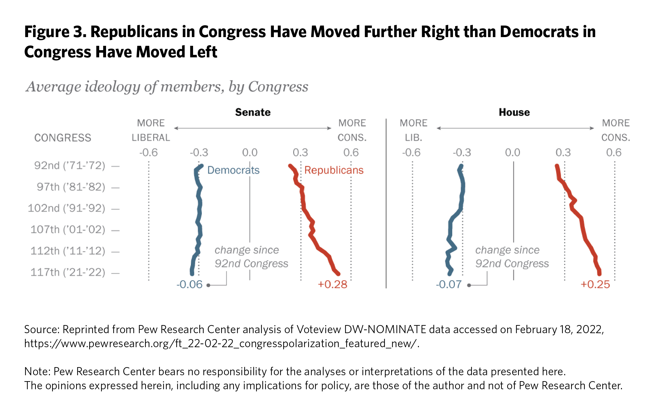 - Ideological polarization was highly asymmetric. Republican members of Congress were moving to the right ideologically much faster than Democratic members were moving to the left (see figure 3).