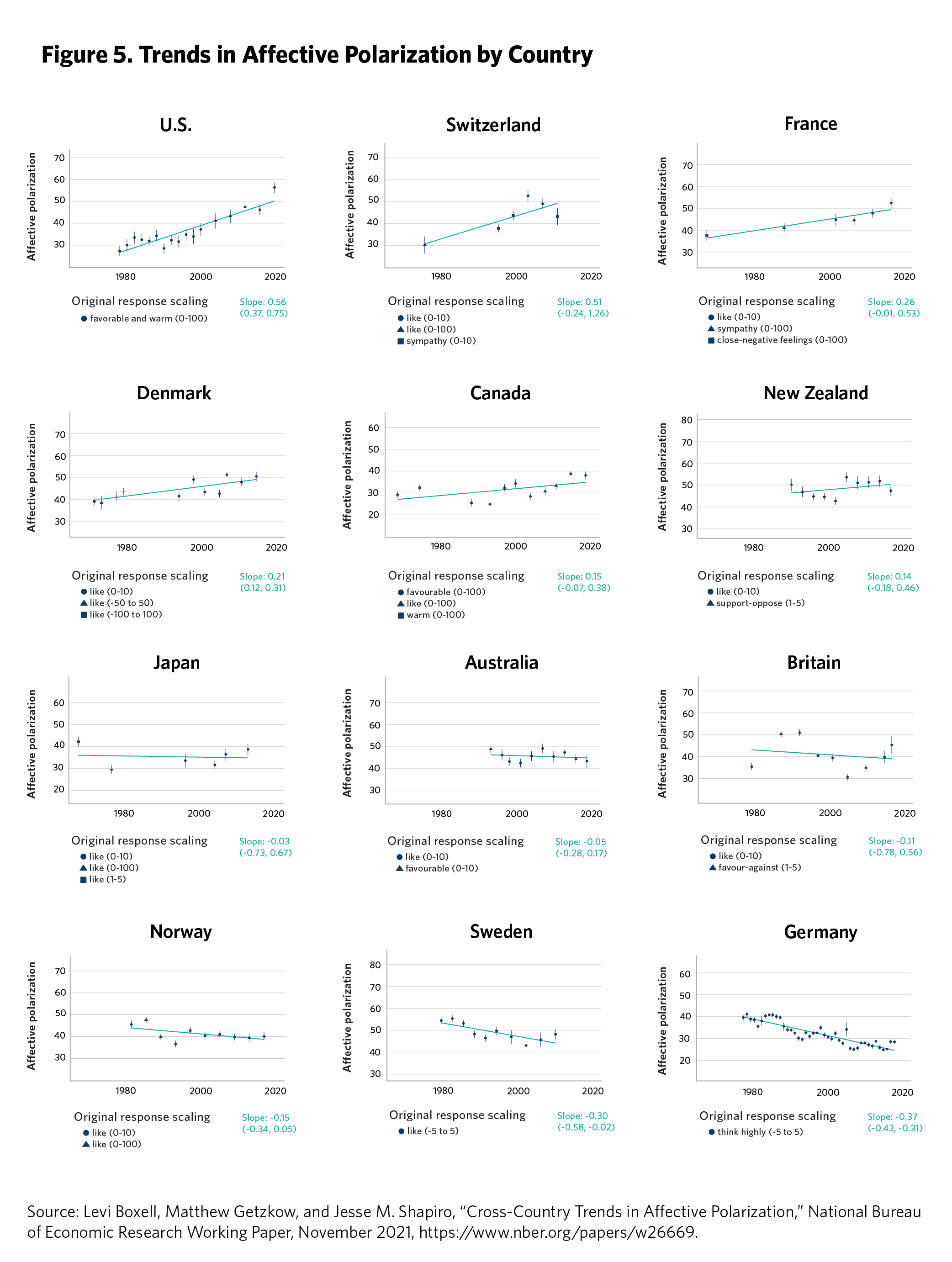 There is a problem with engaging in such interventions to improve U.S. democracy, however. While affective polarization is growing quickly in the United States, it is actually not much higher there than in many European countries. In other words, many European countries show affective polarization at about the same level as that of the United States, but their democracies are not suffering as much, suggesting that something about the U.S. political system, media, campaigns, or social fabric is allowing Americans’ level of emotional polarization to be particularly harmful to U.S. democracy.16